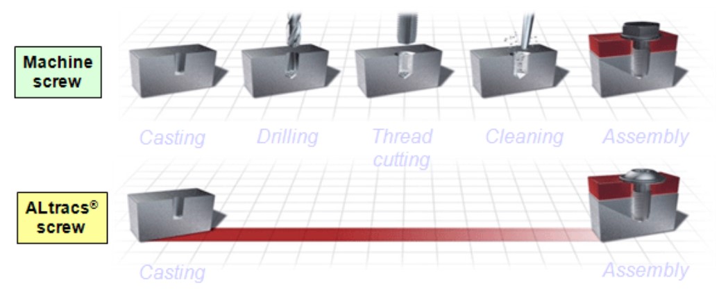 ALtracs® 캐스트 홀에 직접 체결하는 Self tapping screw로 Machine screw와 비교시 40%이상 비용 절감 효과가 발생한다.